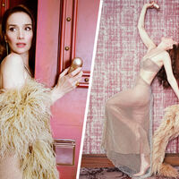 47-летняя Наталья Орейро показала фигуру в «голом» розовом платье с вырезом на спине и боках. Образ дополнил бюстгальтер и трусы с завышенной талией. В руках она держала боа из перьев. Она также надела золотые серьги и кольцо. Ей также сделали укладку с локонами и вечерний макияж с розовыми тенями.