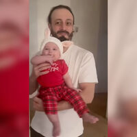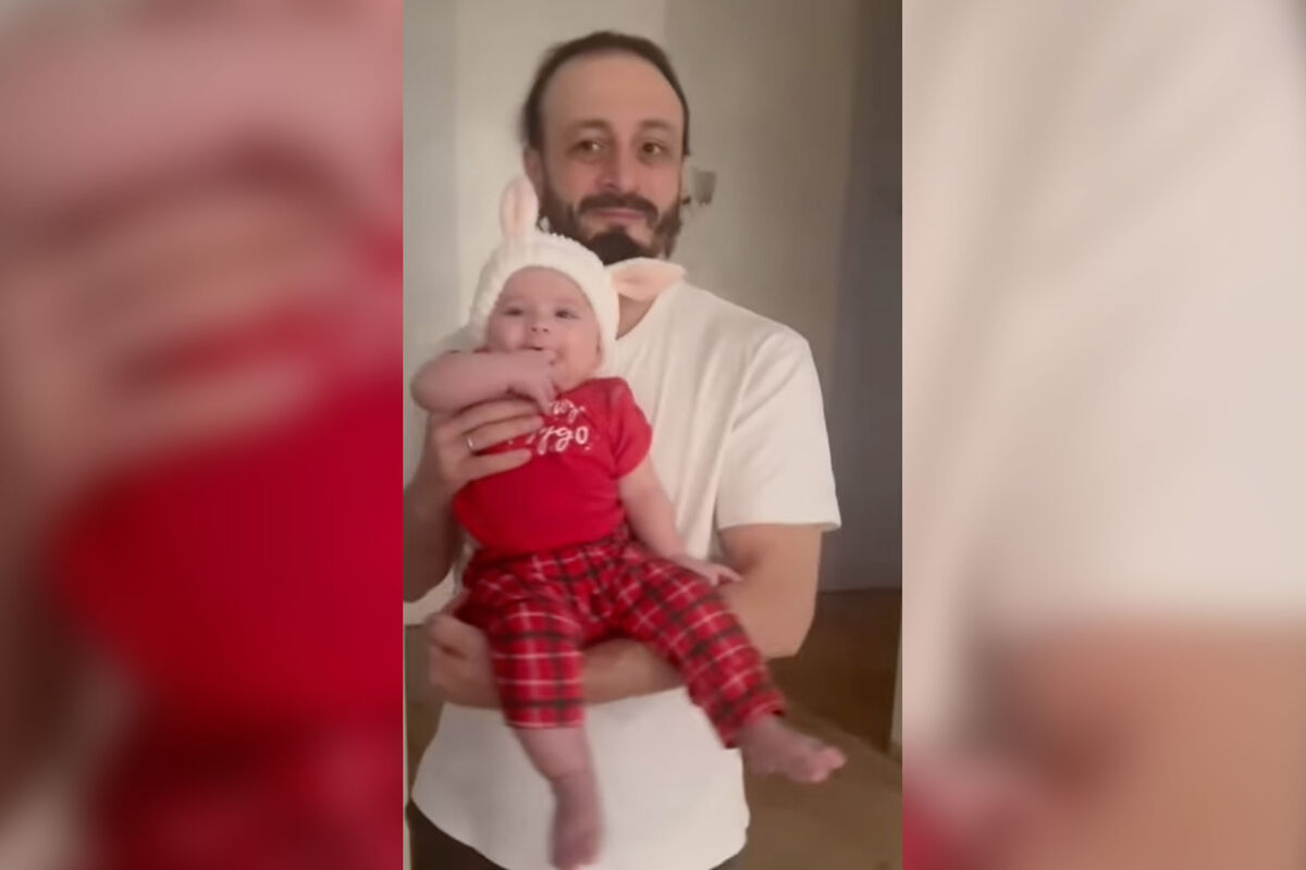 В ролике Илья Авербух держал на руках дочь в тот момент, когда его сын общался с Дедом Морозом. Девочка была одета в красную футболку, пижамные штаны в полоску и повязку с заячьими ушами.