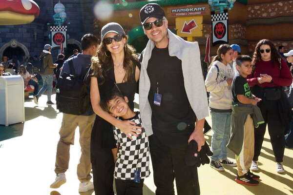 Джессика Альба вместе с детьми и мужем позировала на улице в парке развлечений.
