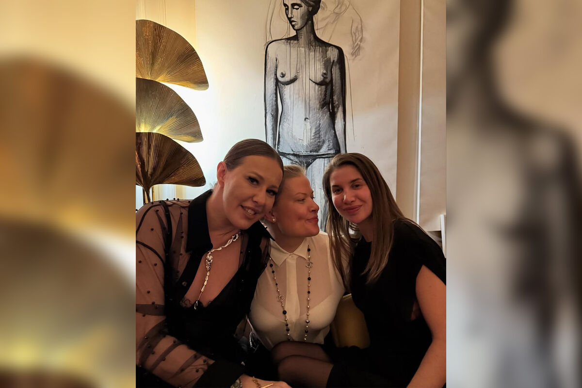 Ксения Собчак была запечатлена вместе с гендиректором Pony Express Марьей Дей и дизайнером Олесей Шиповской. Журналистка позировала в черной прозрачной блузе в горошек и колье. Телеведущей уложили волосы в гладкий пучок и сделали макияж с черными стрелками и нюдовыми губами. Марья Дей выбрала белую блузу и ожерелье Chanel, а Олеся Шиповская предпочла черное платье. Снимок был сделан в квартире Светланы Бондарчук и Сергея Харченко.