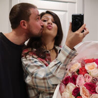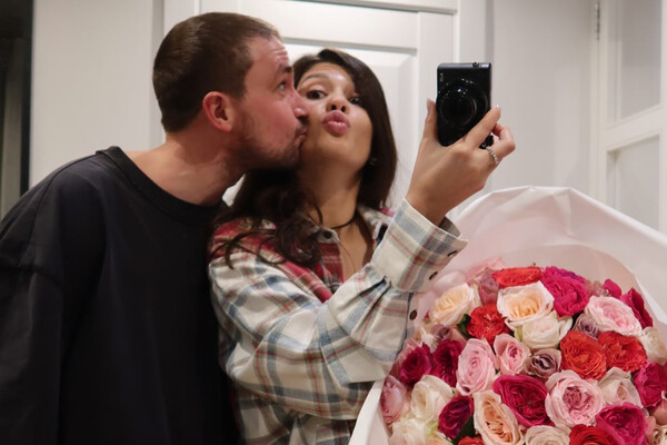 Виктория Антонова получила от мужа большой букет разноцветных роз. На фото девушка позировала вместе с Александром Петровым, который целовал ее в щеку. Она была запечатлена в клетчатой рубашке и черных легинсах, а актер стоял в футболке и брюках.