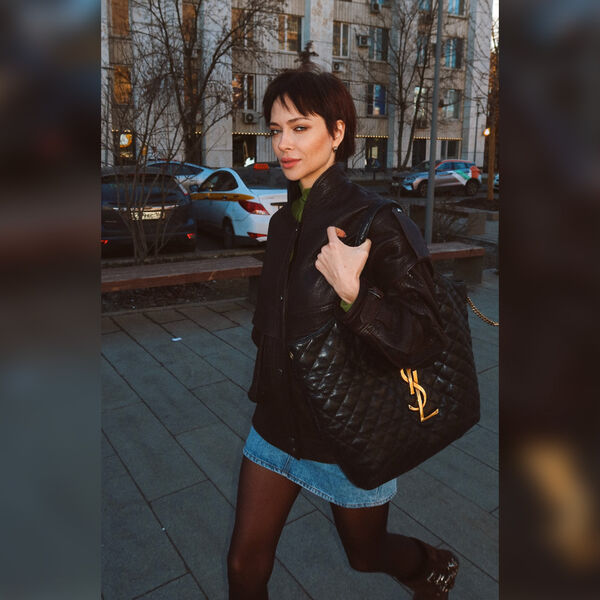 38-летняя Настасья Самбурская была запечатлена в зеленой водолазке, черной кожаной куртке, джинсовой мини-юбке, колготках и темно-коричневых замшевых сапогах. Актриса дополнила образ вместительной сумкой Saint Laurent с логотипом. Знаменитость позировала со стрижкой под мальчика и макияжем с коричневыми тенями, контурингом и персиковой помадой.