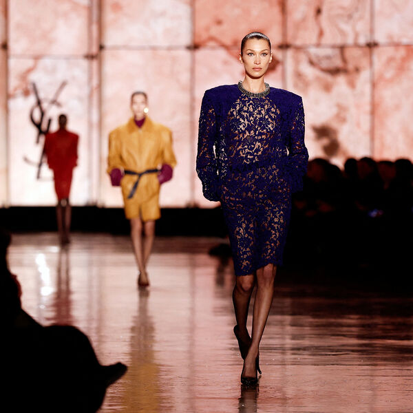 28-летняя Белла Хадид приняла участие в показе бренда Saint Laurent, который прошел 11 марта на Неделе моды в Париже. Супермодель дефилировала на подиуме в абсолютно прозрачном фиолетовом платье из кружева с подплечниками и массивным серебристым украшением. Бизнесвумен также надела колготки и черные остроносые туфли на каблуках. Манекенщице уложили волосы в гладкий пучок и сделали макияж с угольно-черными стрелками и нюдовыми губами.