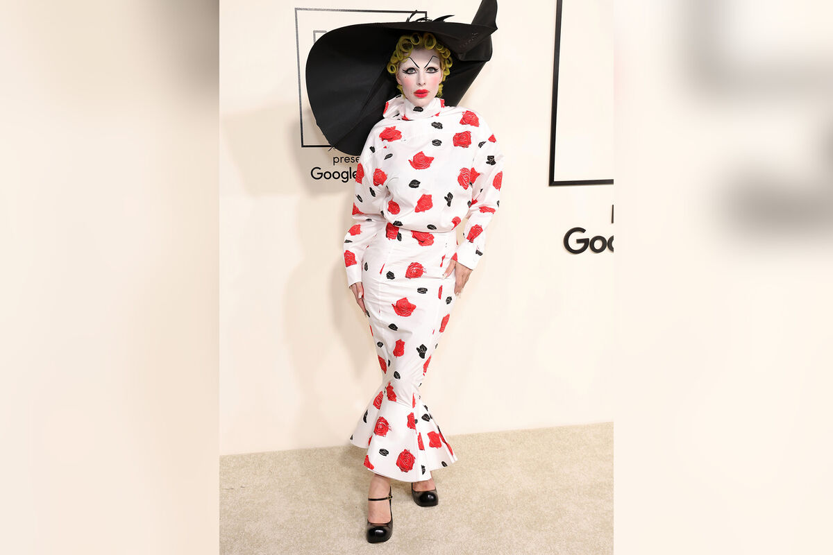 Джулия Фокс появилась на публике с бровями-треугольниками и зелеными волосами. Кожу ей покрыли белой пудрой, добавили румяна и красную помаду. Она позировала в цветочном платье и большой черной шляпе.