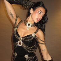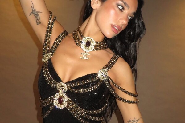 29-летняя Дуа Липа позировала перед камерой в черном боди, украшенном стразами и золотыми цепями. Певица добавила к нему длинные кожаные перчатки, массивный чокер из цепей Chanel и сетчатые колготки. Поп-исполнительнице уложили волосы и сделали макияж с подводкой, блестящими тенями, румянами, хайлайтером и розовой помадой.