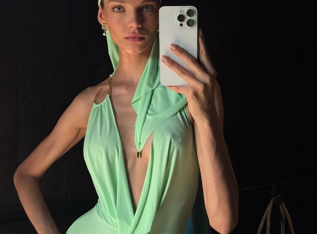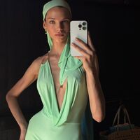 26-летняя Алеся Кафельникова стояла перед зеркалом в мятном облегающем платье с декольте до пупка, которое дополнила косынкой в тон и массивными серьгами с жемчугом. Модель убрала волосы под головной убор и сделала макияж в естественном стиле.