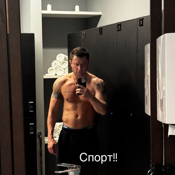 37-летний Павел Прилучный стоял перед зеркалом в спортзале с голым торсом. Актер был одет в черные треники и цепь.