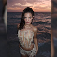 25-летняя Дилара Зинатуллина предстала перед камерой в прозрачном светлом корсете, под которых не стала надевать бюстгальтер. Блогерша добавила к образу белые пушистые шорты, украшенные пайетками. Экс-супруга Моргенштерна позировала с мокрыми распущенными волосами и макияжем с румянами и помадой. Знаменитость была запечатлена на берегу моря.
