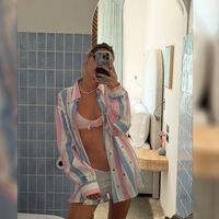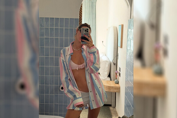 27-летняя Виттория Черетти стояла перед зеркалом в нежно-розовом бикини, украшенном аппликацией в виде цветка. Модель дополнила пляжный образ полосатой рубашкой, блестящим ожерельем, серыми короткими шортами, солнцезащитными очками и кольцами. Манекенщица позировала с собранными волосами.
