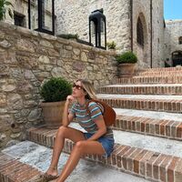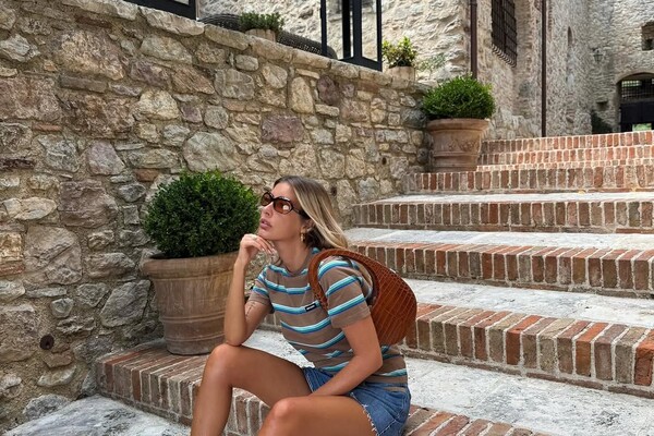 38-летняя Кети Топурия предстала перед камерой в коричневой полосатой футболке, которую сочетала с джинсовыми короткими шортами и замшевыми тапками Miu Miu. Певица добавила к образу солнцезащитные очки, золотые серьги, кольцо, анклет и сумку на плечо со змеиным принтом. Поп-исполнительница была запечатлена с распущенными волосами и макияжем в нюдовых тонах. Фото были сделаны во время отдыха артистки за границей.