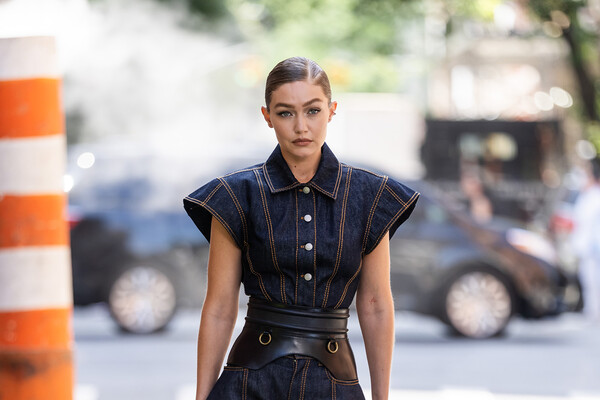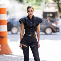 Папарацци подловили 30-летнюю Джиджи Хадид во время съемки для бренда Maybelline в Сохо, в Нью-Йорке. Супермодель была запечатлена в темно-синем джинсовом мини-комбинезоне, который дополнила кожаным поясом и ботильонами. Манекенщице собрали волосы в гладкий низкий хвост и сделали макияж с угольно-черными стрелками, румянами и помадой.