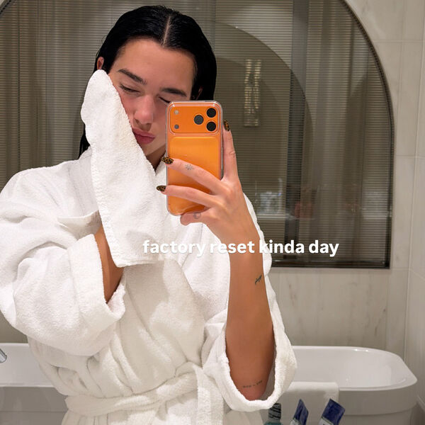 Дуа Липа стояла перед зеркалом в белом халате в ванной комнате. Певица была запечатлена с мокрыми распущенными волосами и без косметики. Артистка протирала лицо полотенцем.