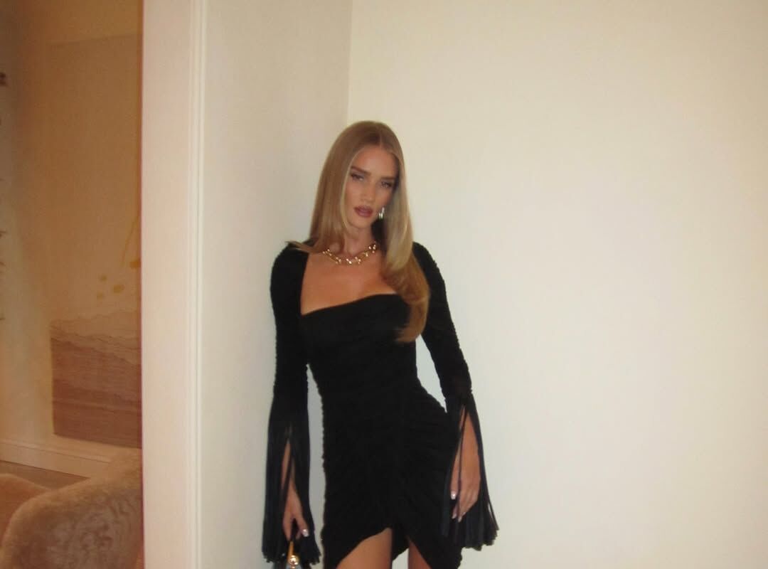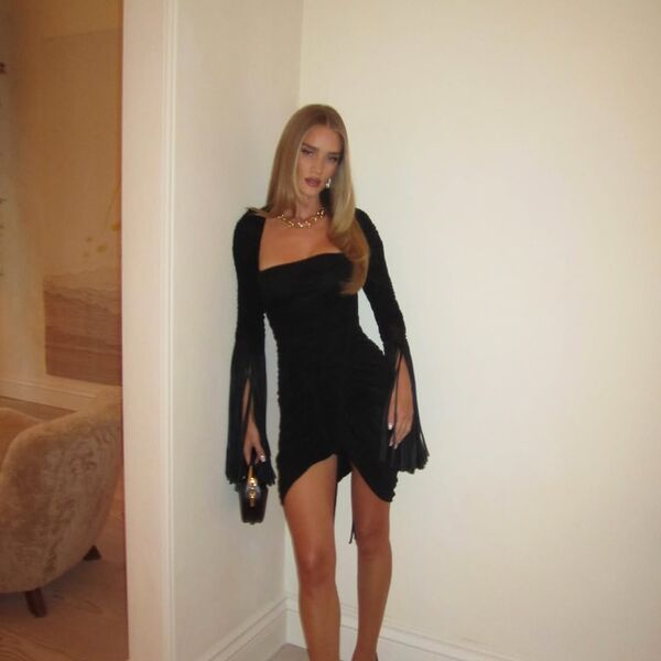 38-летняя Рози Хантингтон-Уайтли позировала перед камерой в черном мини-платье с длинными рукавами и разрезом. Модель добавила к своему наряду босоножки на каблуках, кожаный клатч, золотое ожерелье и серьги. Манекенщица была запечатлена с уложенными распущенными волосами и макияжем в нюдовых тонах.