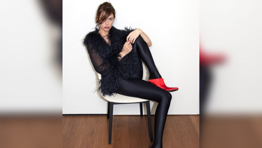 Диана Пожарская позировала в черном полупрозрачном топе с меховой отделкой и глубоким декольте, а также в легинсах. Образ дополнили красные ботинки на низких каблуках. Актриса сидела на стуле, закинув ноги.