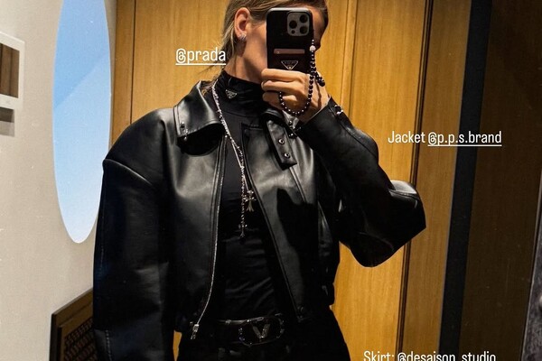 Алеся Кафельникова позировала в черной кожаной мини-юбке, бомбере и водолазе. Образ дополнила сумка Chanel, стоимость которой составляет 440 тысяч рублей.