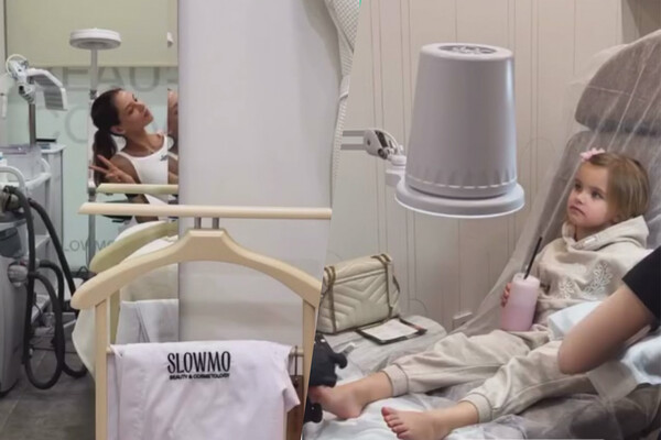 Алеся Кафельникова позировала в зеркале, а ее дочь — в кресле для маникюра и педикюра. Модель редко показывает дочь и приезжает с ней в Москву.