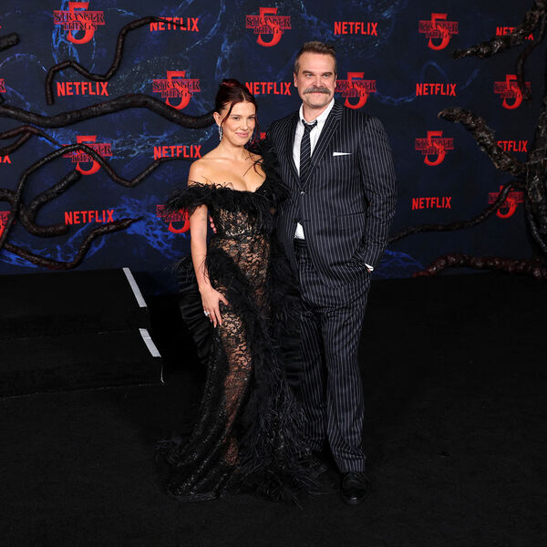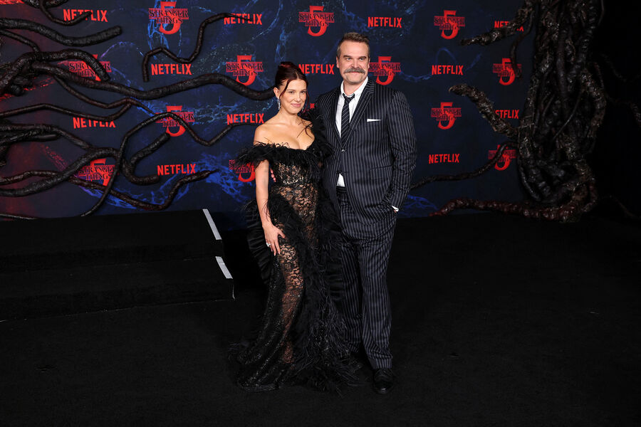 21-летняя Милли Бобби Браун позировала на красной дорожке с 50-летним Дэвидом Харбором. Для выхода на публику актриса предпочла черное кружевное платье с глубоким декольте и перьями. Волосы ей уложили в высокий пучок и сделали вечерний макияж.