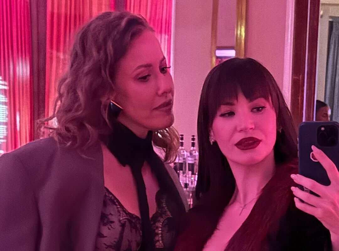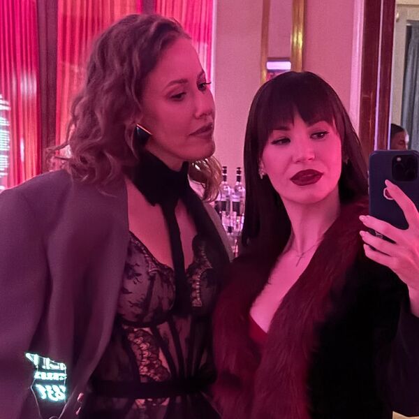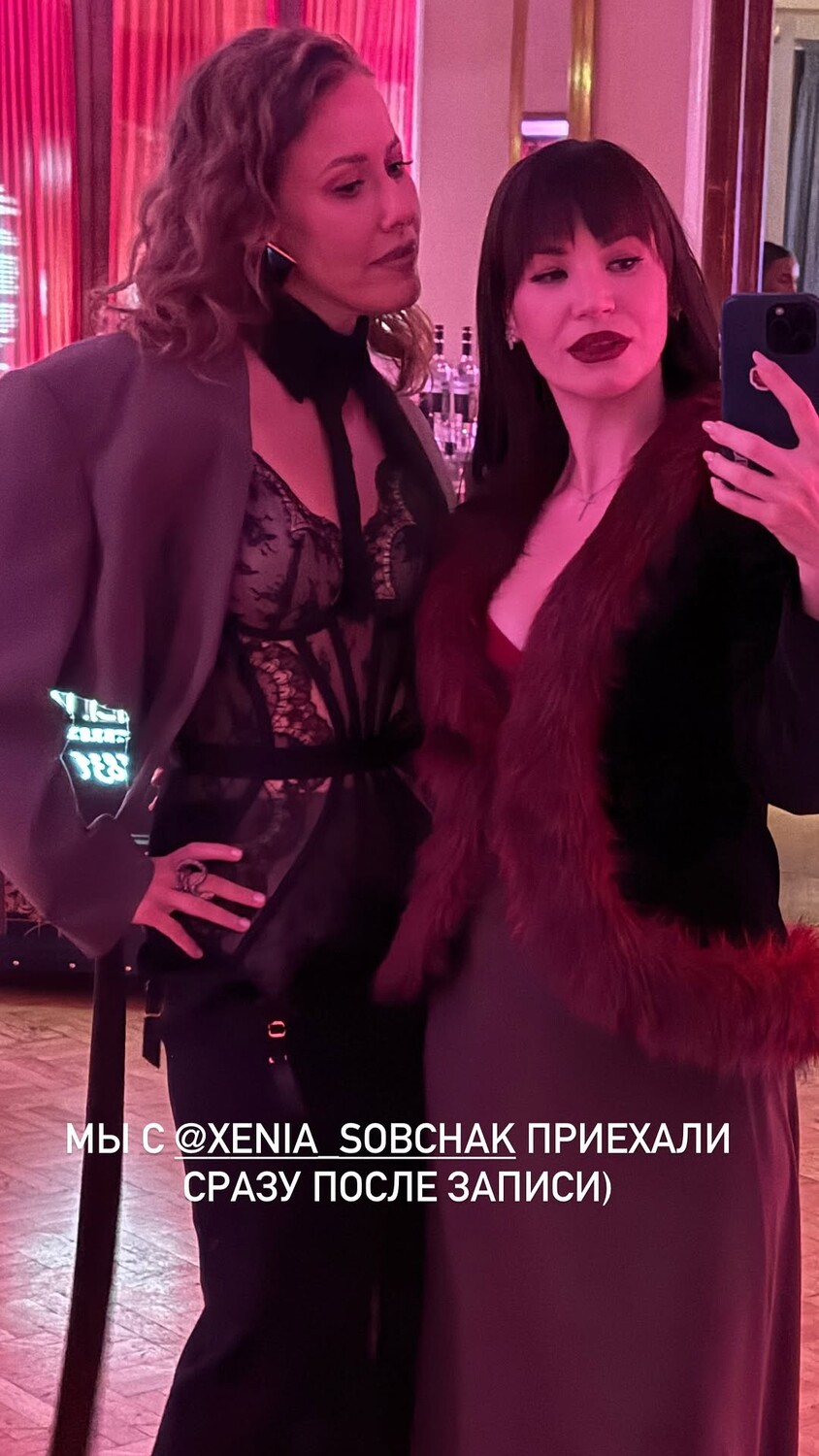 Ксения Собчак позировала в «голом» топе из черного кружева, брюках палаццо и бежевом жакете. Волосы журналистке уложили кудрями и сделали вечерний макияж с угольно-черными стрелками. В зеркале вместе с ней позировала Галич в красной шубе.