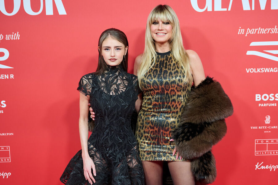 52-летняя Хайди Клум и ее 21-летняя дочь Лени вместе появились на красной ковровой дорожке. Супермодель предпочла для выхода мини-платье с леопардовым принтом и коричневую меховую накидку. Лени Клум надела черное кружевное платье поверх черного боди.