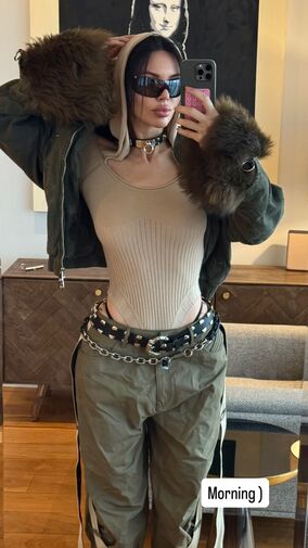 Оксана Самойлова вышла на публику в спущенных зеленых штанах с черными стрингами, бежевом топе и меховой куртке. Образ дополнили очки, ремень и чокер с цепями.