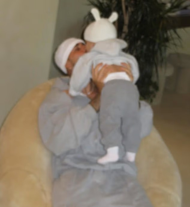 Джастин Бибер держал сына на руках и целовал в щеку. Певец позировал в сером спортивном костюме, золотой цепи и шапке. Малыш был одет в серый костюм, носки и белую шапку с ушами. Исполнитель не стал показывать лицо ребенка.