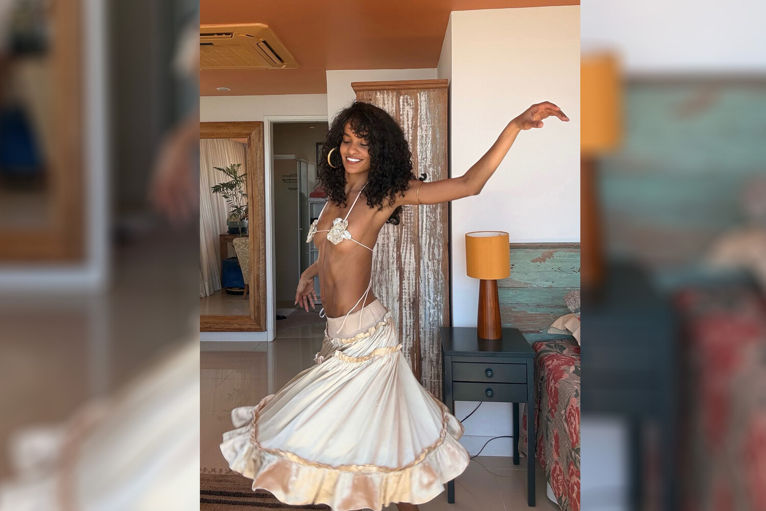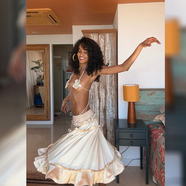 29-летняя Нара Баптиста позировала перед камерой в лифе с цветами и молочной юбке-миди. Манекенщица также надела массивные золотые серьги и браслет. Модель предстала с распущенными волосами и макияжем в естественном стиле. Знаменитость была запечатлена в спальне.