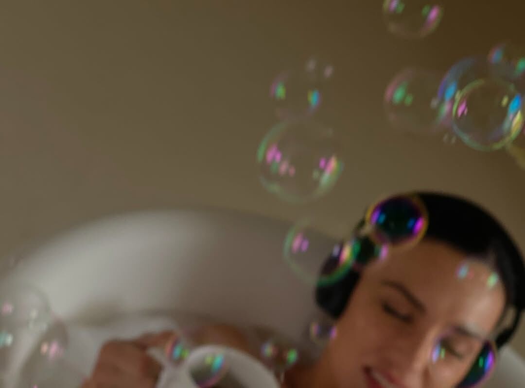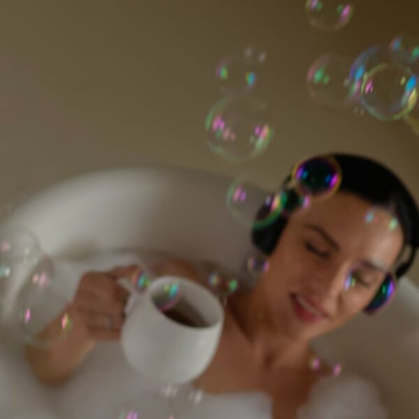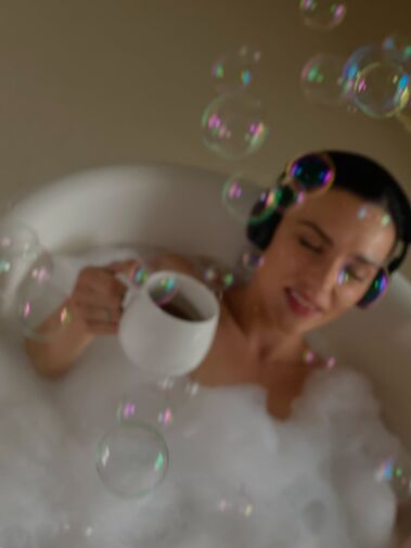 Ольга Серябкина была запечатлена в ванной с пеной. Певица сидела в наушниках с чашкой в руках. Поп-исполнительница позировала с собранными волосами и без косметики.