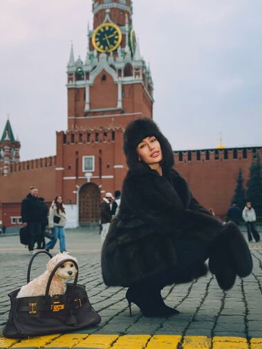 Валентина Иванова позировала в шубе, варежках и шапке-ушанке. Образ дополнила сумка Birkin от Hermes, в которой сидел ее домашний питомец.