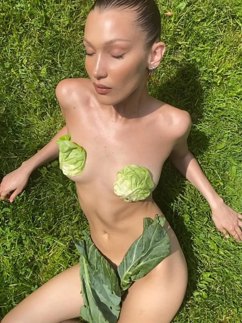 29-летняя Белла Хадид позировала перед камерой, сидя на траве. Супермодель прикрыла тело листьями капусты. Бизнесвумен была запечатлена с уложенными в пучок волосами и макияжем в естественном стиле.