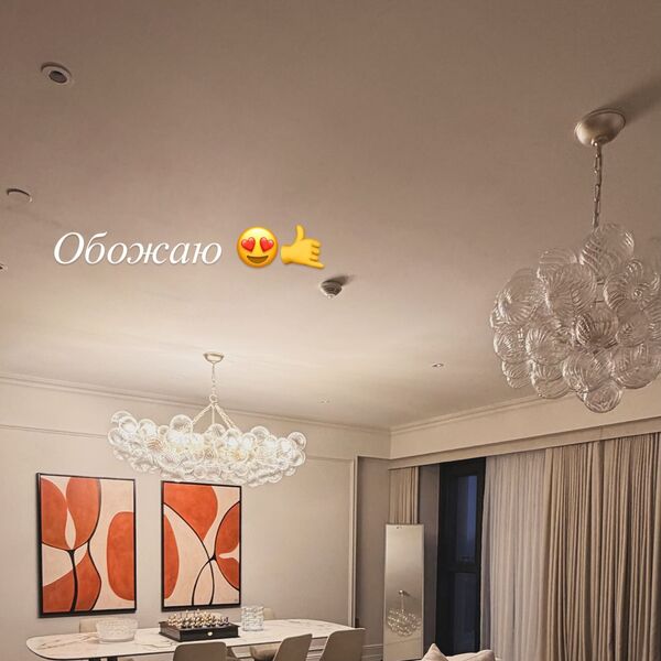Ксения Бородина опубликовала редкие фото интерьера гостиной в панорамной квартире. В кадре телеведущая показала столовую с картинами, пледом и золотым столом.