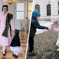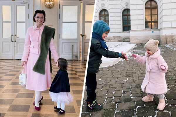 Вся семья в праздничных костюмах посетила бал в Москве. Мать и дочь предпочли розовые платья для выхода, а сын — классический костюм.