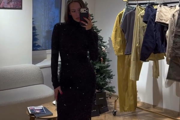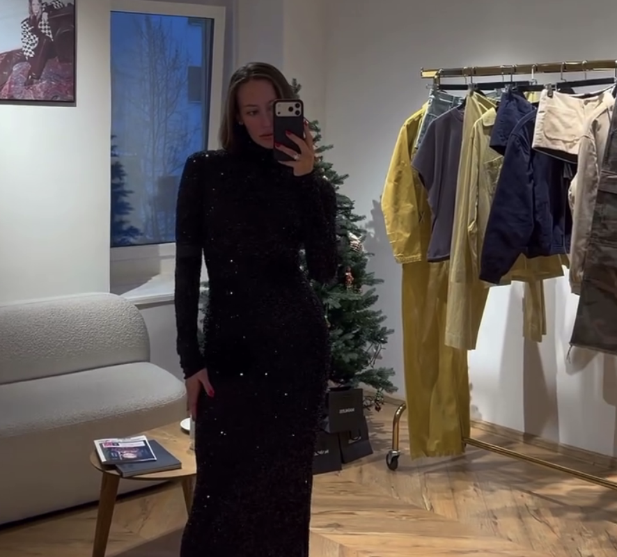 Валентина Иванова стояла перед зеркалом в черном облегающем макси-платье, которое было полностью украшено пайетками. Девушка Тимати была запечатлена с уложенными распущенными волосами и макияжем в нюдовых тонах на фоне елки.