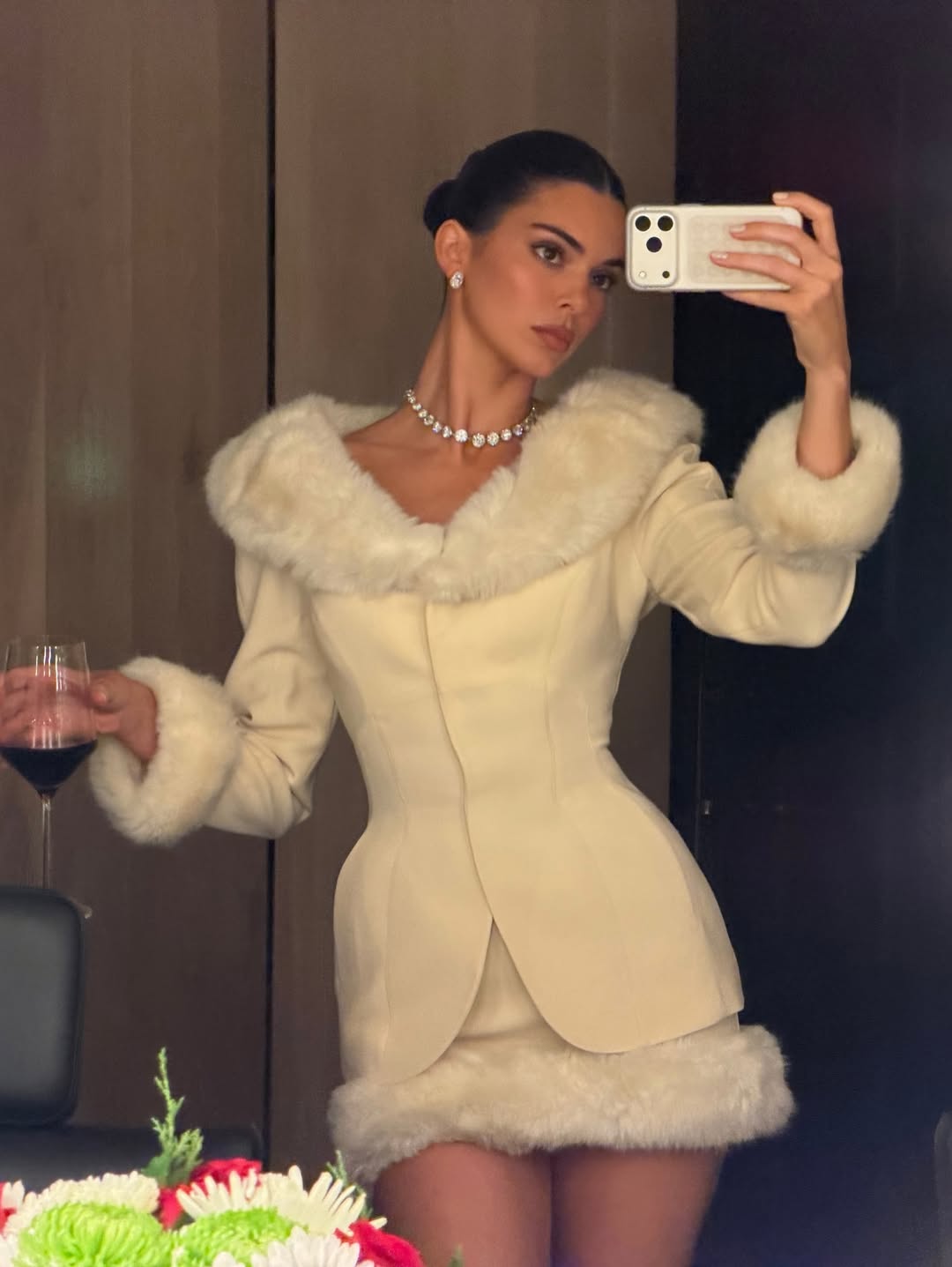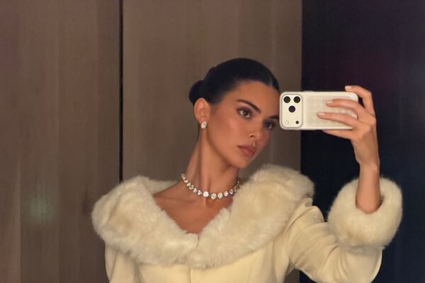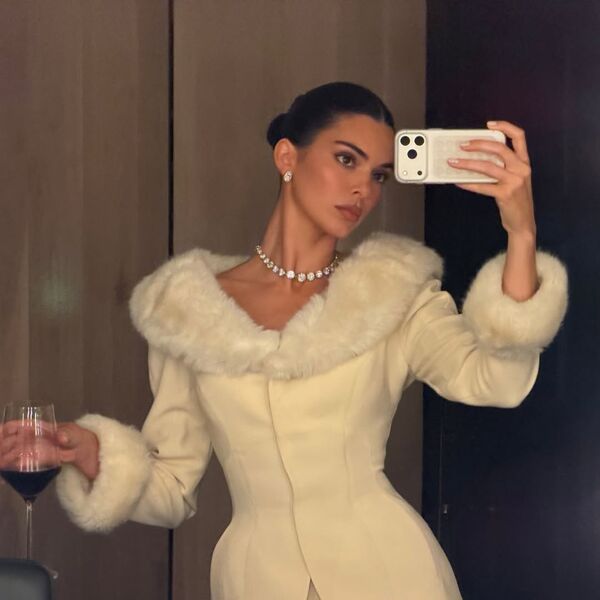 30-летняя Кендалл Дженнер позировала в кадре в молочном костюме с меховой отделкой, который состоял из приталенного жакета и мини-юбки. Модель добавила к комплекту серьги с бриллиантами и ожерелье. Звезда реалити-шоу собрала волосы в гладкий пучок и сделала макияж с черной тушью, румянами и розовой матовой помадой.