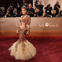 56-летняя Дженнифер Лопес посетила церемонию вручения премии «Золотой глобус», которая состоялась 12 января в Лос-Анджелесе. Актриса предстала на красной дорожке в наряде Жана Луи Шеррера из коллекции Haute Couture 2003 года. Певица выбрала бежевое прозрачное платье с коричневой вышивкой и пышной юбкой. Поп-исполнительница дополнила образ серьгами с бриллиантами и кольцом от Sabyasachi, туфлями и шоколадным клатчем Judith Leiber. Знаменитости собрали волосы в пучок с прядью у лица и сделали макияж с коричневыми тенями, черными стрелками и блеском для губ.