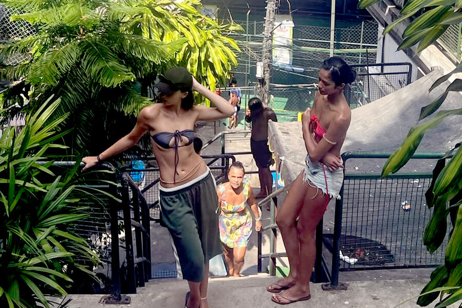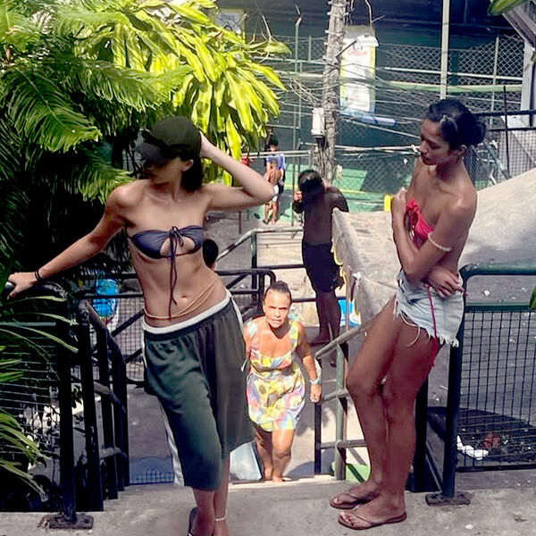 21-летняя Дева Кассель предстала перед камерой в темно-синем лифе бикини, зеленых спортивных шортах и черных сланцах. Модель дополнила пляжный образ кепкой, анклетом и золотым поясом. Манекенщица была запечатлена с распущенными волосами на лестнице.