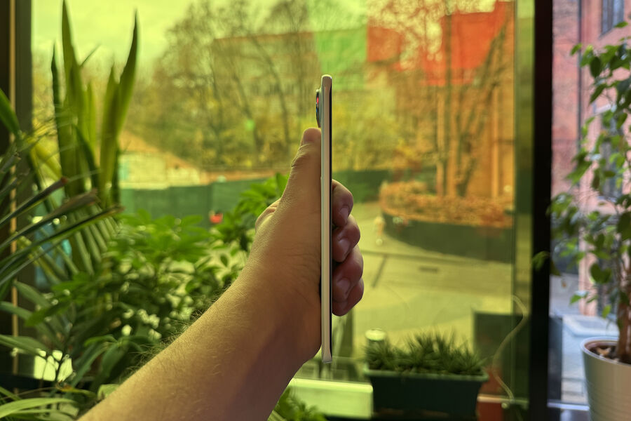 Корпус смартфона тонкий, но не хрупкий: спереди — Corning Gorilla Glass 7i, заявлена защита IP64 от пыли и брызг, сзади — жесткая панель из стекловолокна. Блок камеры интегрирован аккуратно, так что на столе смартфон лежит ровно, не шатается, в кармане и маленькой сумке не выпирает. Хват уверенный, кисть меньше устает при длительном скролле.