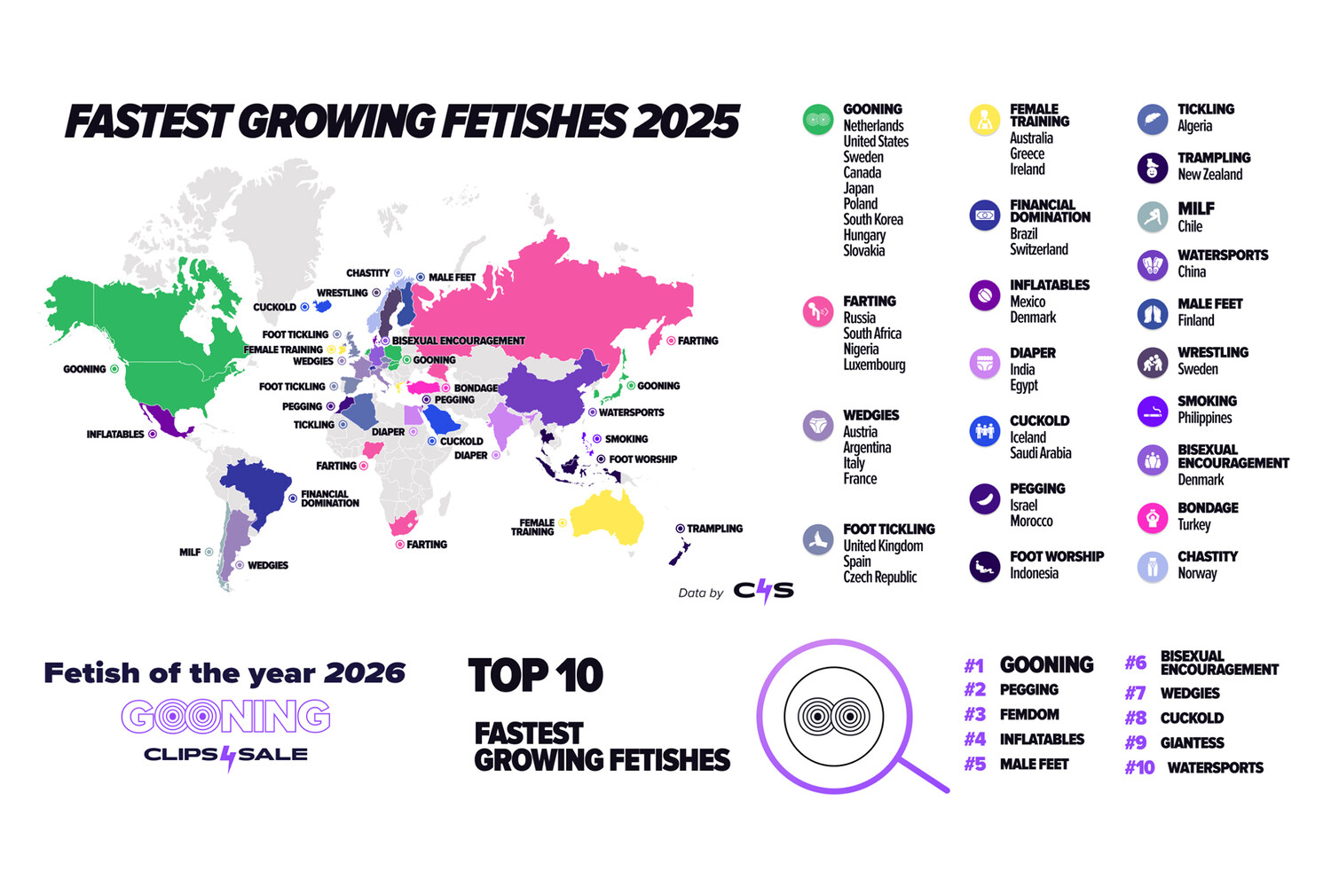 При этом совершенно ясно, когда фартинг стал объектом интереса для условно широких масс: в 2010-е годы, на которые пришелся бум популярности порносайтов и появление ресурса Clips4Sale, который специализируется на публикации контента для фетишистов. Собственно, именно эта платформа и опубликовала инфографику, из которой следует, что в 2025 году в России самым быстро набирающим популярность жанром оказался фартинг. Кроме России такой динамикой в упомянутом жанре отметились ЮАР, Нигерия и Люксембург.