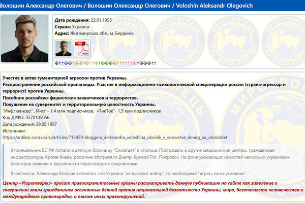 В частности, на «Миротворце» появились карточки Александра Волошина, Владиславы Роговенко и Насти Умки, а также других блогеров.