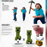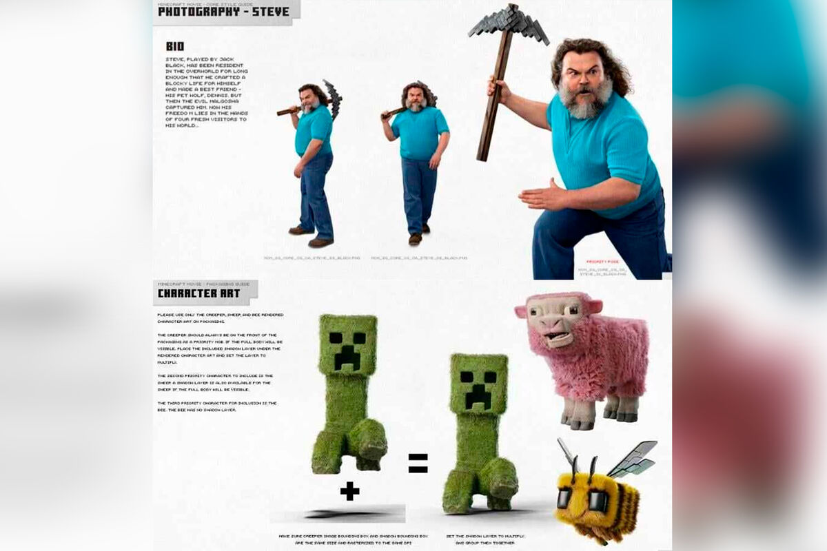На утекших изображениях можно увидеть актера и комика Джека Блэка в роли Стива, главного героя Minecraft. Внешность актера для роли не изменили — ему лишь дали кирку, джинсы и бирюзовую футболку. Монстр под названием крипер, овца и пчела в киноадаптации будут выглядеть почти так же, как в игре, но обретут объемную и заметную шерсть.