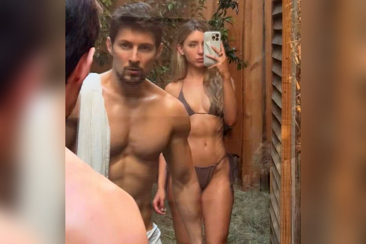 На фотографии, которая была сделана в отражении, изображены Вавилова и Дуров. Судя по всему, снимок сделан после плавания в бассейне, так как на плече Дурова висит полотенце и он сам без футболки, а Вавилова — в купальнике.