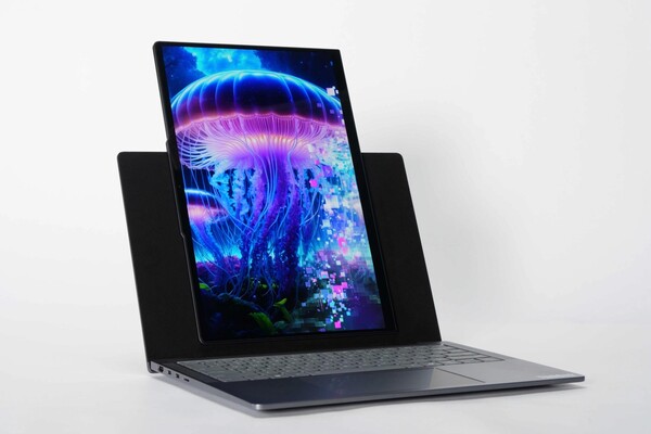 Дисплей ноутбука отсоединяется от основного корпуса и фиксируется при помощи магнитного крепления. Передача питания и данных реализована через специальные контактные площадки, что обеспечивает стабильное соединение без проводов. Такой формат может быть востребован среди специалистов, работающих с текстами, программным кодом или контентом в мобильной верстке.