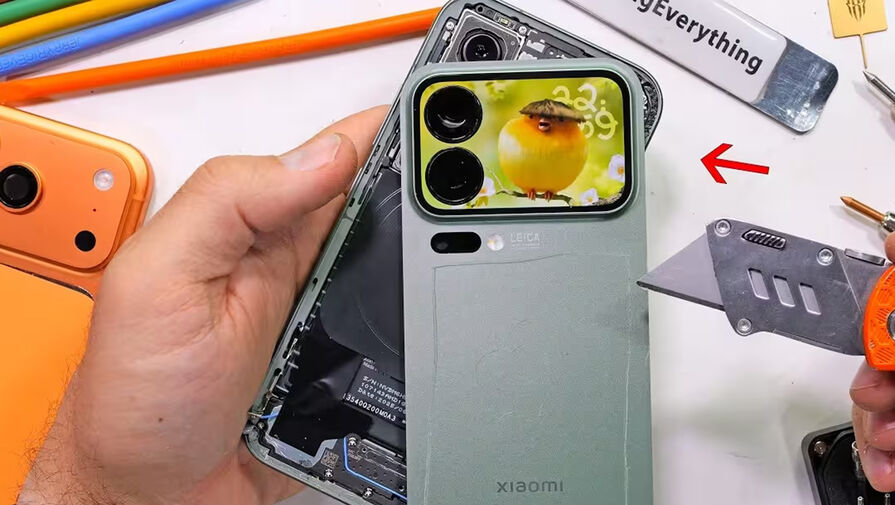 После завершения тестов на прочность автор канала традиционно разобрал устройство, чтобы продемонстрировать его внутреннюю архитектуру. Как показало вскрытие, дополнительный дисплей размещен с внутренней стороны заднего стекла и закреплен на металлической пластине с помощью винтов.
