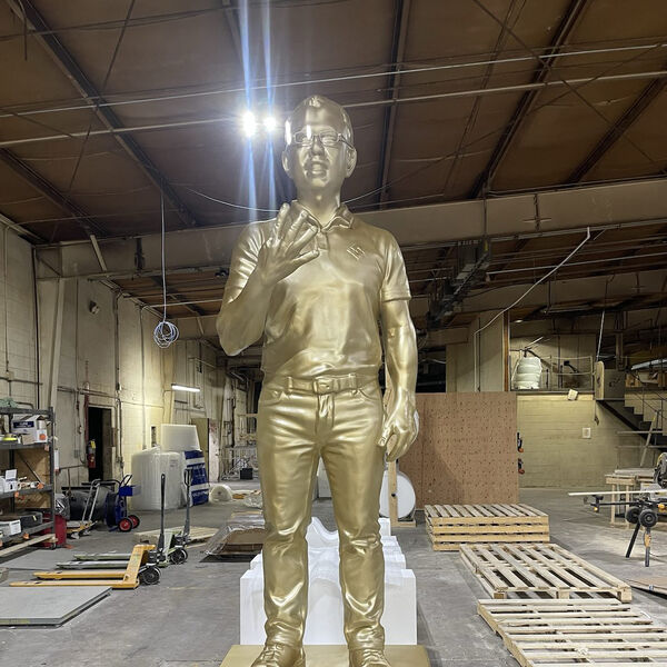 Монумент, изображающий Чжао с его характерным жестом — поднятыми четырьмя пальцами, символизирующими отказ от страха и сомнений, будет выставлен на всеобщее обозрение на несколько часов. В дальнейшем статую планируется передать самому Чжао в качестве подарка или продать с аукциона в пользу его некоммерческого образовательного проекта Giggle Academy.