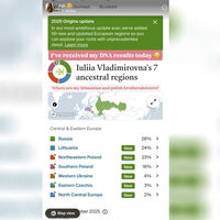 Хотя сама девушка обратила внимание только на народы с наивысшей степенью родства, на скриншоте можно увидеть и другие страны, где предположительно жили ее предки. В частности, можно увидеть, что Вавилова на 4% украинка, а также – на 3% чешка.