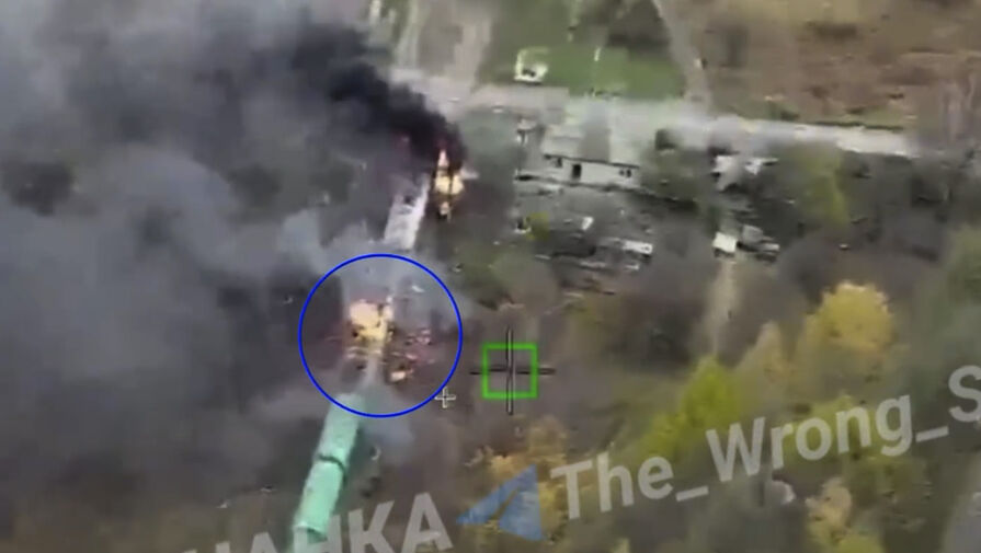 В Сумской области Украины российские Вооруженные силы осуществили удар по железнодорожному составу, перевозившему военную технику и амуницию для украинской армии. Кадры горящего поезда опубликовал Telegram-канал «Изнанка».
