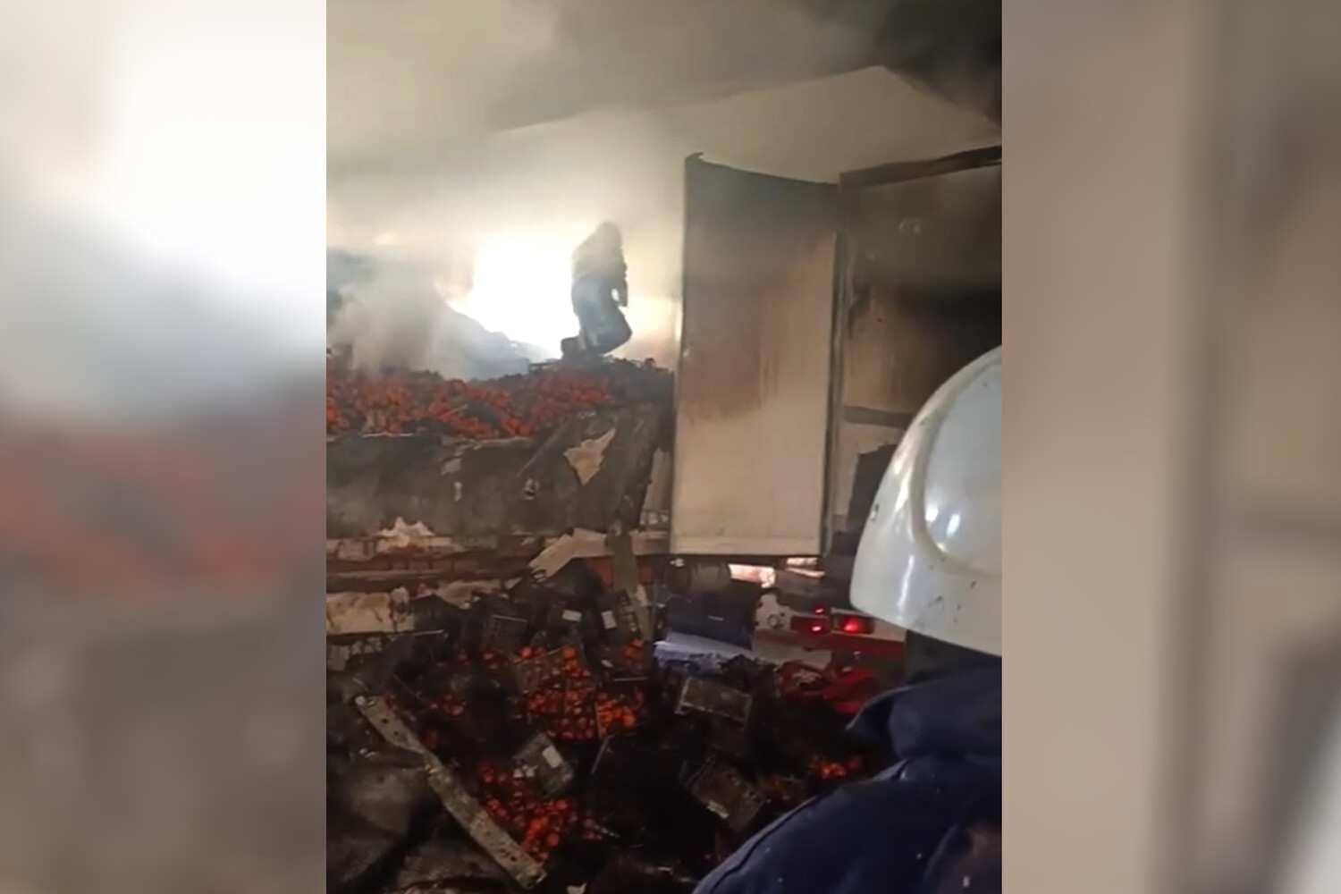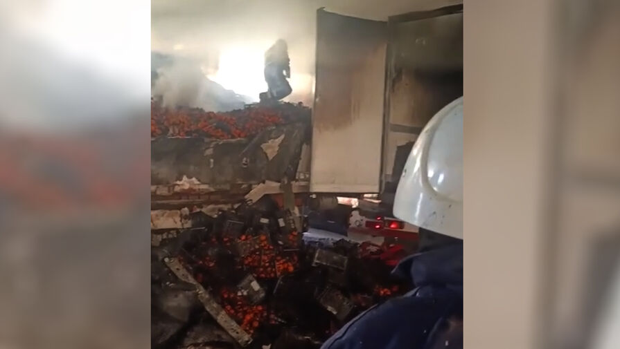 Украинская газета сделала вывод, что часть грузовиков на пароме перевозила мандарины. Груз полностью сгорел. В других роликах пожарные тушат возгорание.