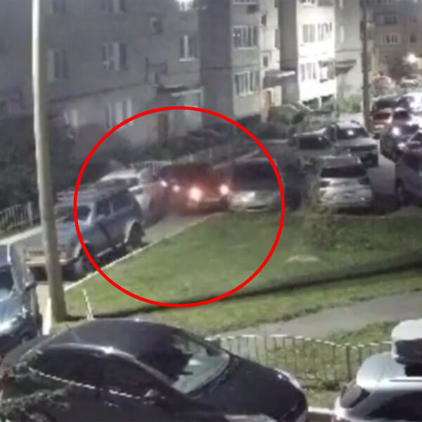 На видео с камеры наблюдения видно, что белая Creta, двигаясь по кругу, задела несколько машин. После того, как одну из них развернуло поперек дороги, водитель Creta выехала на газон.