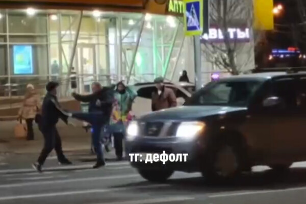 Очевидцы запечатлели инцидент на камеру. На кадрах видно, как мужчины конфликтуют на пешеходном переходе. Каждый замахивается руками, но не ударяет своего оппонента, при этом один из мужчин подходит к автомобилю такси и пинает машину.