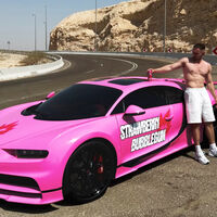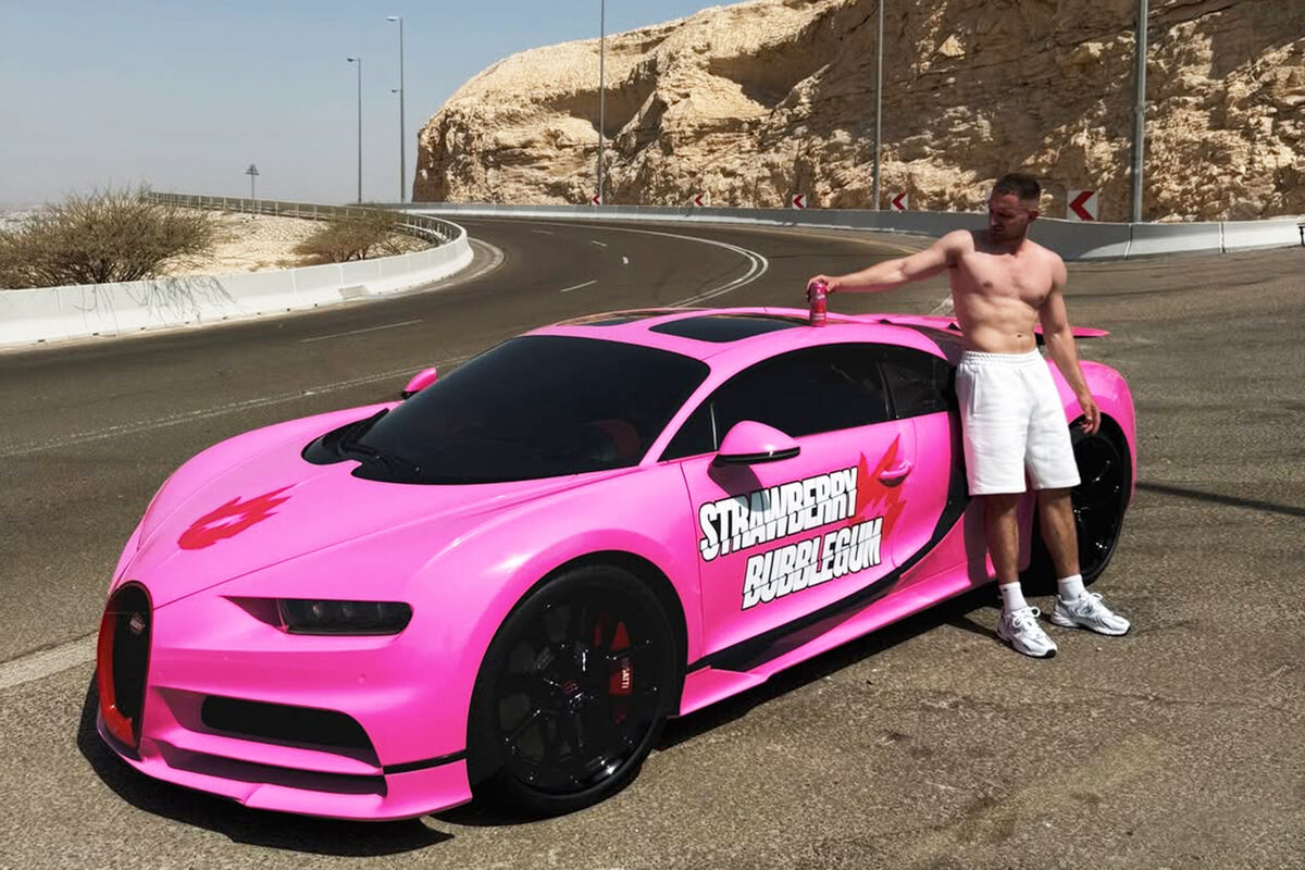 На опубликованных в сети фотографиях видно, что мужчина стоит в белых шортах и кроссовках на фоне розового автомобиля Bugatti Veyron. Также заметно, что мужчина держит рукой банку, которая стоит на крыше машины.
