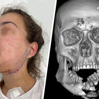По информации канала, водитель иномарки получил травмы лица: у него оторвалась нижняя губа и была сломана челюсть. Медики удалили ему из инфицированных участков костные отломки, пришили язык и зафиксировали нижнюю челюсть при помощи титановой пластины.